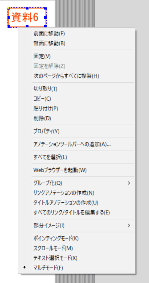 001.次のページ以降の全ページにアノテーションをコピー(削除)する方法(05.Docu) 23月 20242 3月 2024コメントを追加 ①Docu文章を開き、コピーしたい内容(アノテーション)を右クリックし、「次のページからすべてに複製」 なお、削除したい時は、Docuの最初の画面で、ファイル自体を選択し、「ページの加工」➡共通➡アノテーションを全て削除。 共有: X で共有 (新しいウィンドウで開きます) X Facebook で共有 (新しいウィンドウで開きます) Facebook いいね 読み込み中…